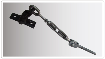 The compression clamp is made of steel St 37-2. The turnbuckle body is made of steel C45 and the turnbuckle eye and oval eye are made of steel C15. The connector between the turnbuckle and the pad is made of steel St 37-2 and it is plastisized. Bolts and pins are made of steel.The mounting pad is made of steel and bears an inserted section of suitable insulating material.